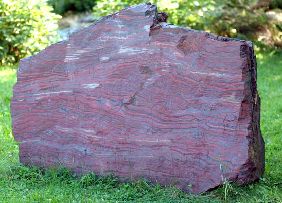 (También conocidas como banded ironstone formations BIF formaciones bandeadas de hierro en piedra) son un distintivo tipo de roca frecuentemente encontrados en rocas sedimentarias primordiales. La estructura consiste en repeticiones de capas delgadas de óxidos de hierro, magnetita o hematita, alternadas con bandas de pizarra y cuarzo microcristalino pobre en hierro. Algunas de las mas antiguas formaciones rocosas tienen alrededor de 3000 millones de años. Estas formaciones son mucho menos frecuentes despues de los 1800 millones de años, aunque se han encontrado unas cuantas mucho mas jóvenes. La cantidad total de oxñigeno encerrado en los lechos de estas formaciones se estima en 20 veces el volumen de oxígeno presente en nuestra atmósfera moderna. Las formaciones bandeadas de hierro en piedra son importantes como fuente comercial de hierro, asi las de Pilbara en Australia Occidental. |