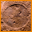 Dickinsonia is known from Vendian rocks of south Australia and north Russia. It is often considered to be an annelid worm because of its apparent similarity to one genus of extant polychaete, Spinther. However, in the opinion of some, it may in fact be a cnidarian polyp, like a soft-bodied version of the "banana coral," Fungia. The specimen pictured above is an adult one from the Ediacara Hills of southern Australia. We also have a picture of a young Dickinsonia costata from the Winter Coast of the White Sea, in the collections of the Paleontological Institute of the Russian Academy of Sciences in Moscow. |