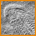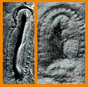 The striking Vendian fossil Spriggina (shown here) and its close relative Marywadea make up the Sprigginida, a clade of soft-bodied organisms that are restricted to the Precambrian. Spriggina is known largely from the Ediacara Hills of south Australia, near Adelaide. The organism had a crescent-shaped head and numerous segments tapering to the posterior end; it is only about three centimeters long. Spriggina was described as an annelid (segmented worm), but it now appears to be related to the arthropods, although Spriggina had no hard parts, and it is unclear exactly what kind of appendages it had. Compare it to our pictures of trilobites and see what you think! |