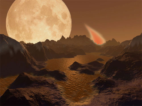 Image: This started as a pre-Huygens Mission NASA rendering of Titan by Steven Hobbs. Then we started adding things ... . Don Dixon also has interesting recreations of the Hadean. |