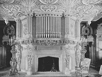 | The white sandstone fireplace with its carved figures, imported from Europe, is the focal point of the living hall. Above the fireplace are the pipes of two Aeolian organs (one manual, one player). A distinguishing feature of the room is the intricate detail of the plaster, pendentive ceiling. The walls are of English oak. The doorway on the left leads to the library and cloister; on right to the Queen Anne salon. |