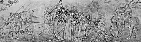 The library is a beautifully proportioned room, finished entirely in light oak. A fine marble mantel and large mirror surmount the fireplace. All of the remaining wall space is devoted to book shelving, at the top of which is a dado of carved oak with a series of symbolic panels representing literature, art, music, drama, architecture, science, agriculture, etc. All of the wood carvings and interior fittings for this room were made in France and put in place by men sent over from Europe especially for this work. |