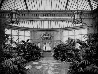 | Upon completing the main house, a palm court, accessible from the cloisters, was built with 10 tons of plate glass. Although construction was completed, Vanderbilt continued to search abroad for rare and unusual decorations. After the bachelor and tennis wing was added, Vanderbilt converted his palm court into a trendy Turkish harem. It was decorated with a large silk tent, couches and Near East ornaments. Also, at this time, a set of ancient Italian stone lions were placed at entrances to the house. Pillars and statuary were installed in the garden. Across the vast front lawn, a wide marble stairway led to the river where a floating mahogany dock anchored Willie K's side paddle steam boat, The Mosquito, used for clamming and fishing excursions. |