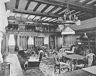 The smoking room is separated from the hall only by a Gothic-style, carved oak screen. The room is dominated by a massive fireplace of sandstone with beautifully carved stone Grecian style ornamentation and by tapestry wall hangings. Most of the furniture was selected abroad and much of it is antique. | |