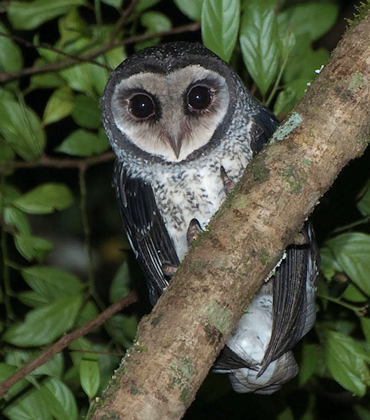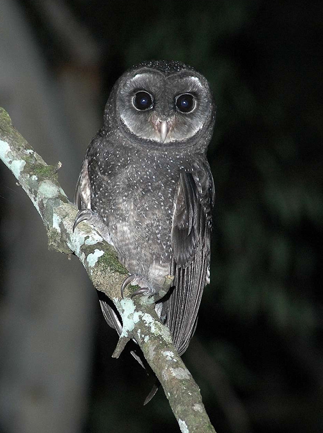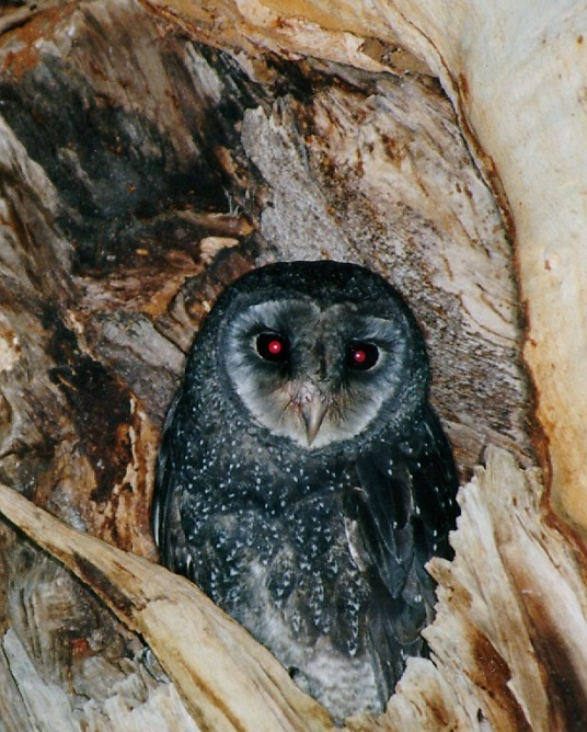 Greater Sooty Owl - Tyto tenebricosa. Known also as Black Owls or Dusky Barn Owls, these birds are rarely seen or heard. Description: A medium large, sooty black Owl with very large, dark eyes set in a round facial disc. The upperparts are sooty black, finely spotted white on the head with larger but sparser white spots on the wings. The Facial disc is large, round and sooty black through to dark grey or silver and is heavily edged black. The underparts vary from sooty black to dark grey, (never as dark as the upperparts) finely spotted with white. The Belly is always paler than the breast. The tail is very short, the legs feathered and eyes very large with a black iris. A Sooty Owl's Bill is horn coloured and feathered almost to the tip. Toes are dark grey and the large talons black. Sexes are similar in plumage and Females are usually slightly larger than males. They are distinguished from lesser Sooty Owls by much larger size and darker plumage, sparser white spots on upperparts and darker underparts which have white spots on a dark background where the lesser Sooty Owl has dark chevrons on a pale background. |