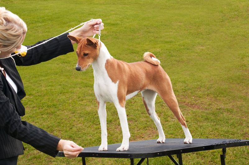 | Nombres alternativos: African Bush Dog, African Barkless Dog, Ango Angari, Avuvi, Congo Dog, Zande Dog, The Jumping Up And, Down Dog, Voiceless Dog País de origen: República Democrática del Congo Clasificación y estándar de la raza El Basenji es una raza de perro originaria del oeste de África. Es una raza primitiva empleada para la caza y el rastreo. Los basenjis tienen la característica única de no ladrar, sino que emiten un curioso sonido al estilo del Canto tirolés (Yodel). Se recomienda para hogares con adultos. Aunque toda la vida guarda un espíritu intranquilo y juguetón, cuando termina su etapa de crecimiento se vuelve una excelente mascota. Algunos relieves del antiguo Egipto representan basenjis junto a otras razas de perros: podencos, galgos y otros. Comportamiento Este perro es muy interesante como mascota. Peculiar del Basenji es que no emite el olor típico de los otros perros. Cuando son pequeños son algo traviesos y les gusta morder, y de esta forma destruir, todo lo que encuentran. Razón por la cual se le debe llevar a clases de obediencia desde temprana edad. Una vez que pasa esa etapa, llegan a ser una gran mascota, aunque el espíritu intranquilo y juguetón lo mantienen de por vida. Por lo general son buenos con los niños de la casa, aunque de acuerdo a algunos autores es más apropiado en un hogar de adultos. Demuestra deseos de complacer a su amo. A este perro no le hace mucha gracia el agua. Se baña él mismo pasándose la lengua como lo hacen los gatos. Lo cual hace que el mantenimiento del pelo sea mínimo. Se le debe permitir hacer ejercicio lo más a menudo posible. Una casa con patio cercado a donde el perro pueda salir y correr un poco todo los días tal vez sea más apropiada para este perro. Al Basenji en inglés se le conoce por “Basenji”, también se le ha llamado “Belgian Congo Dog”. Al Basenji usualmente lo asignan a los Perros Hound. • American Kennel Club: AKC (Estados Unidos). Primer registro en 1944. • United Kennel Club: UKC (Estados Unidos). Reconocido en 1948. • The Kennel Club: KC (Reino Unido). • Federation Cynologique Internationale: FCI (Bélgica, con federaciones afiliadas en prácticamente todo el mundo). Grupo 5. Sección 6. En los perros de “Tipo primitivo”.