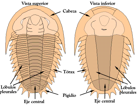 Son los fósiles marinos más característicos del Paleozoico. Tenían tres partes: cabeza, toráx y el pigidio. La cabeza contenía los órganos sensoriales y algunos órganos internnos. El tórax contenía numerosos segmentos. El pigidio era la parte opuesta a la cabeza. La mayoría de los trilobites medían entre 3 y 10 cm., aunque algunos llegaban a medir casi 50 cm. Se cree que respiraban por branquias y que eran externas. |